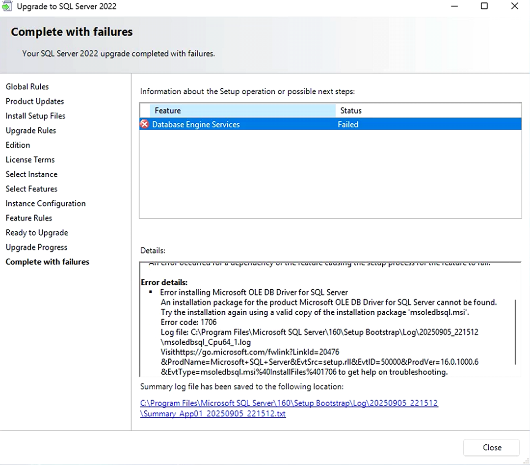 installed, including older backward compatibility components. Cause. This issue often arises from conflicts between installed versions of Microsoft ODBC Driver for SQL Server and/or Microsoft OLE DB Driver for SQL Server. During the SQL Server setup, the installer attempts to reference existing driver packages, but due to mismatched or conflicting versions, it fails to locate the required installation file. Usually the error displayed by SQL Server setup looks like the image below: