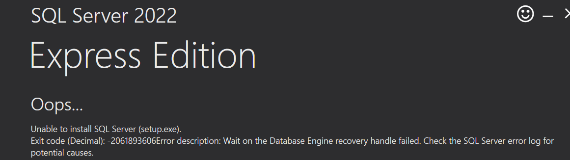 SQL Server 2022 Exit code(Decimal): -2061893606.